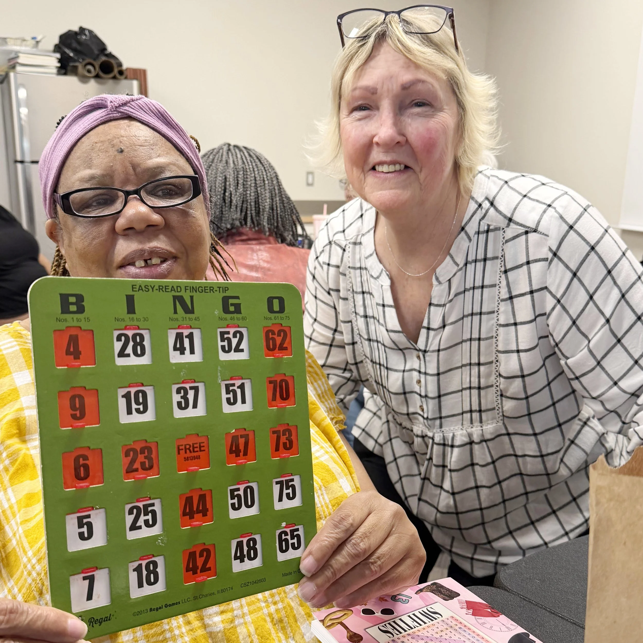 Wednesday bingo became a fixture in Alfrida's week: a consistent, joyful routine that gave her something to look forward to and a community to belong to. Manuel would help her with her bingo numbers when needed, making sure Alfrida could participate fully and enjoy every game.